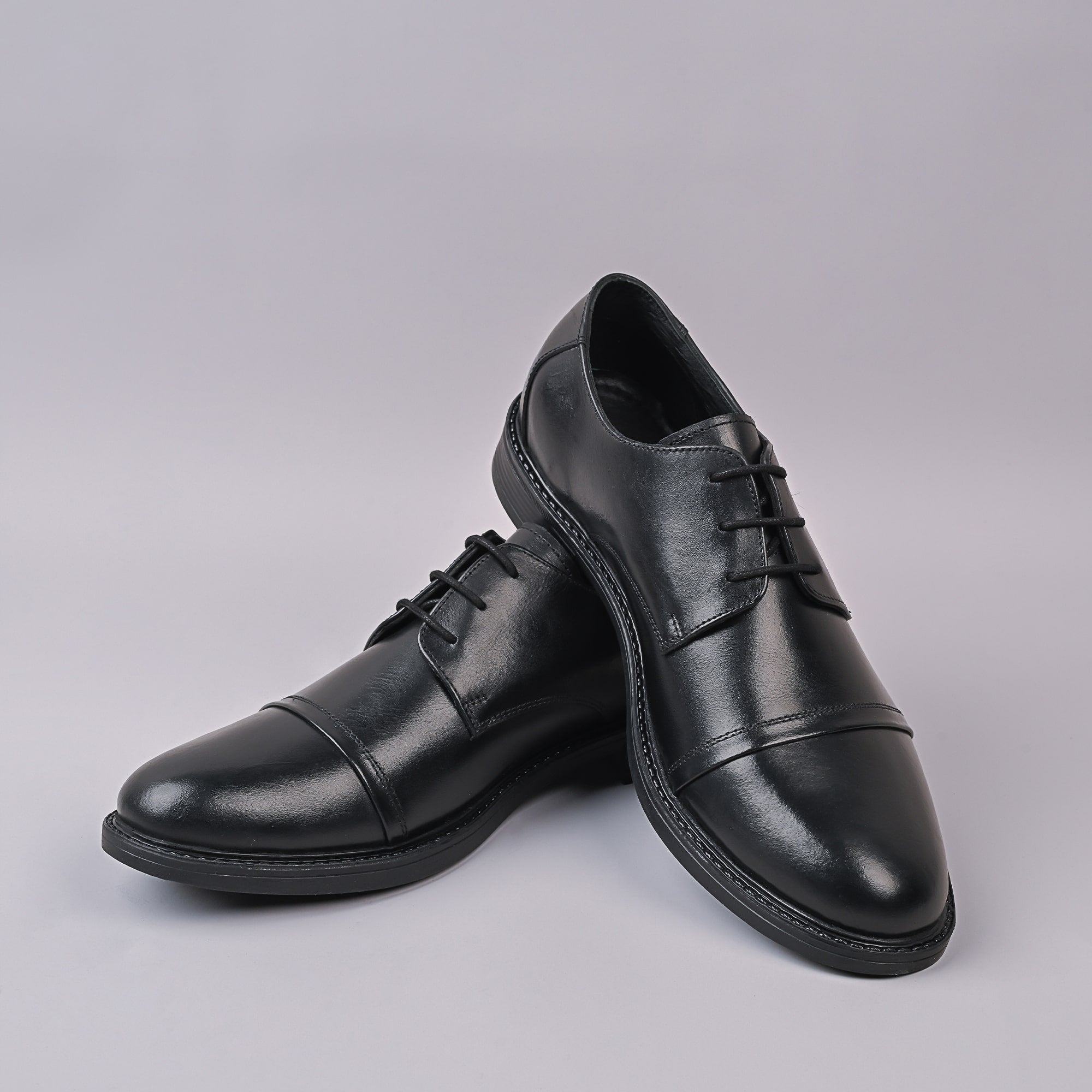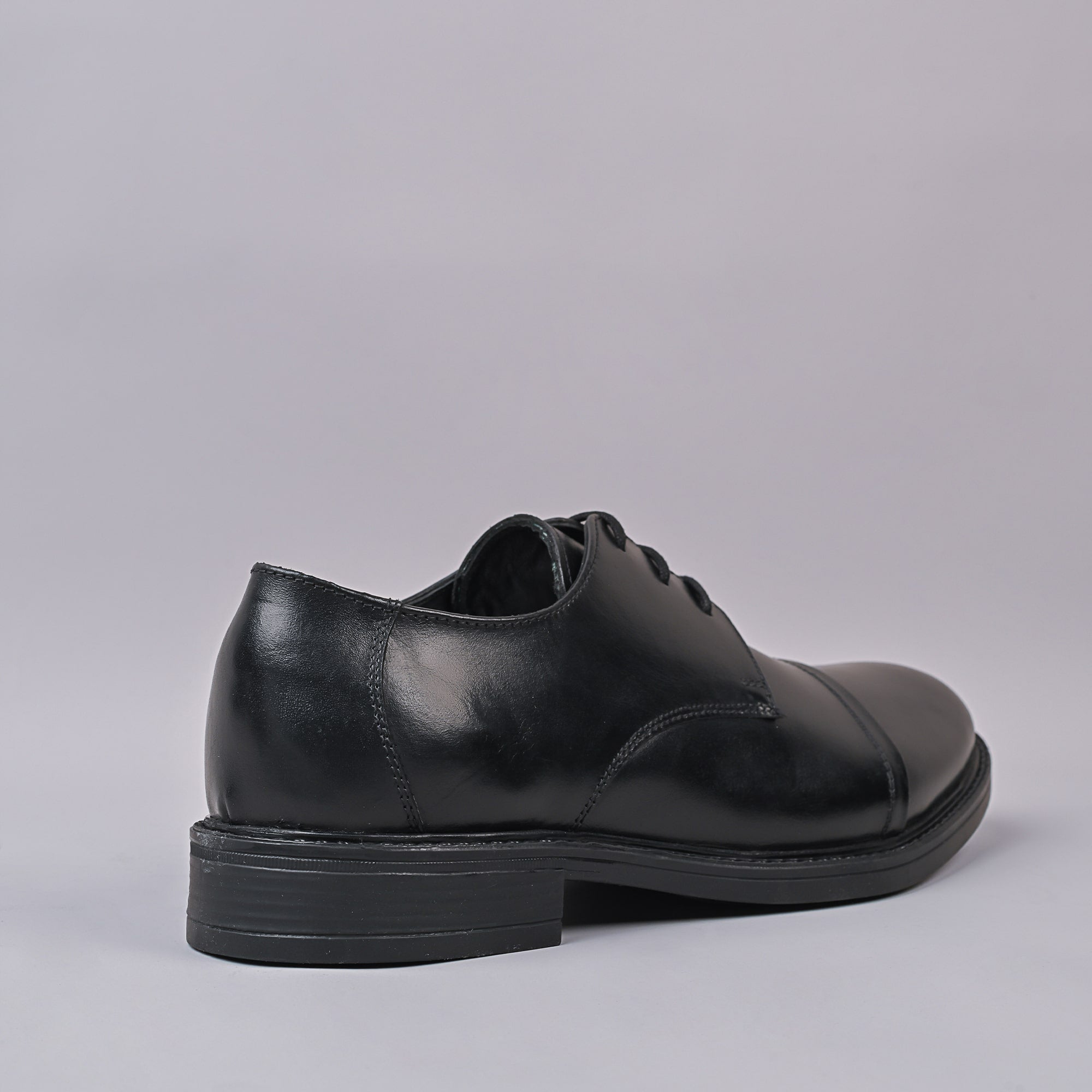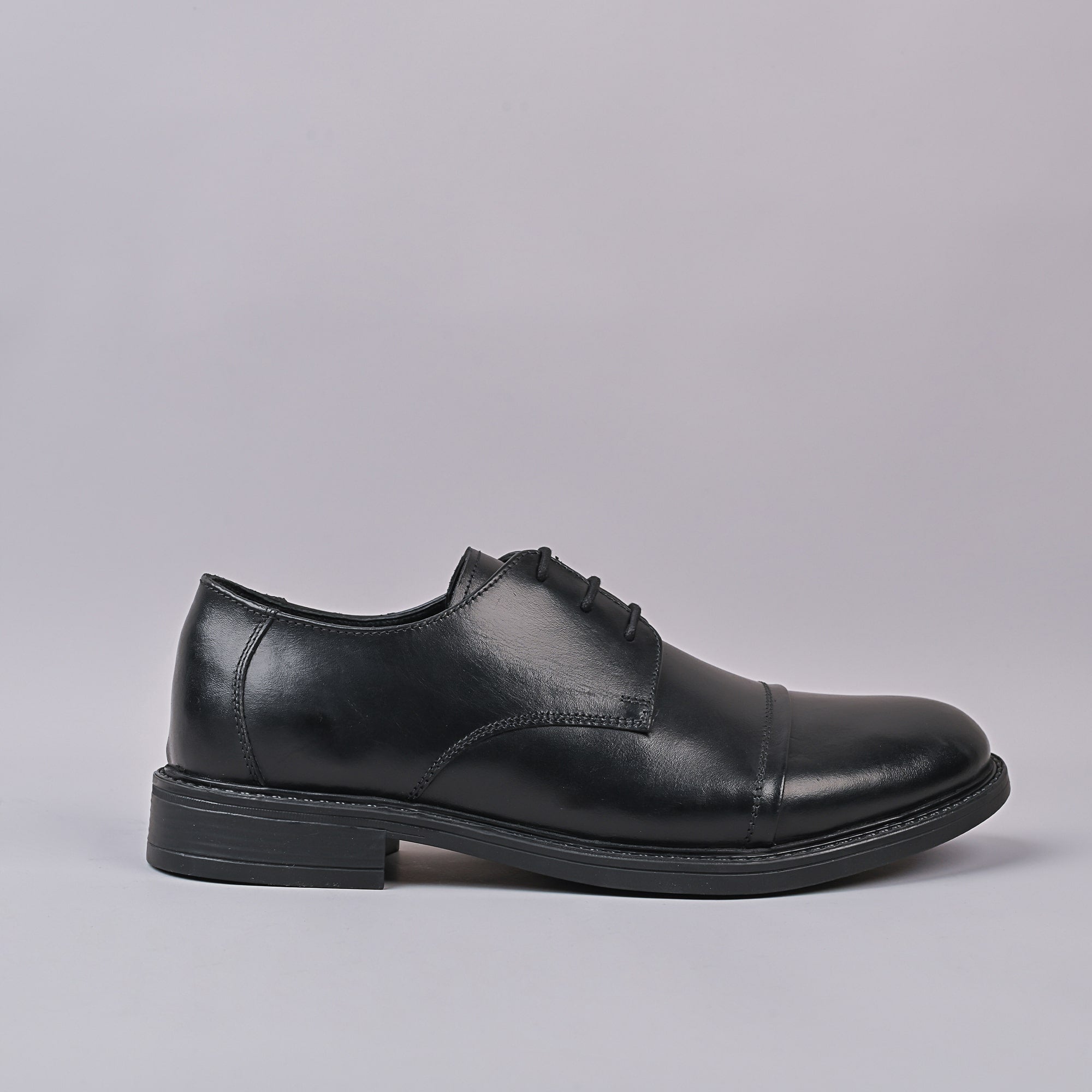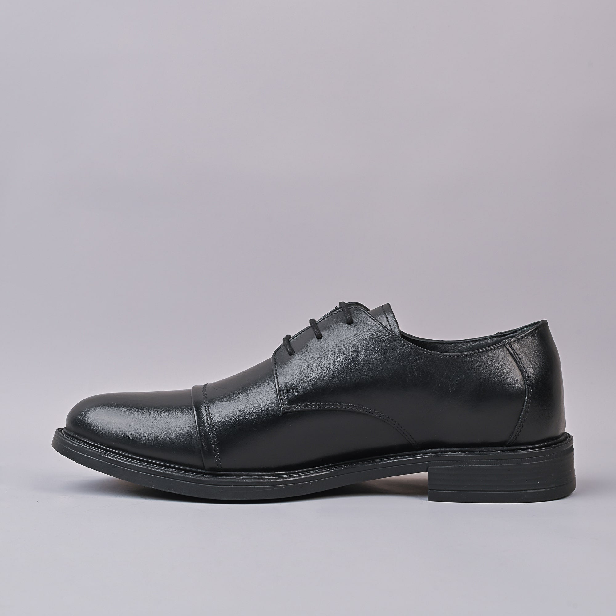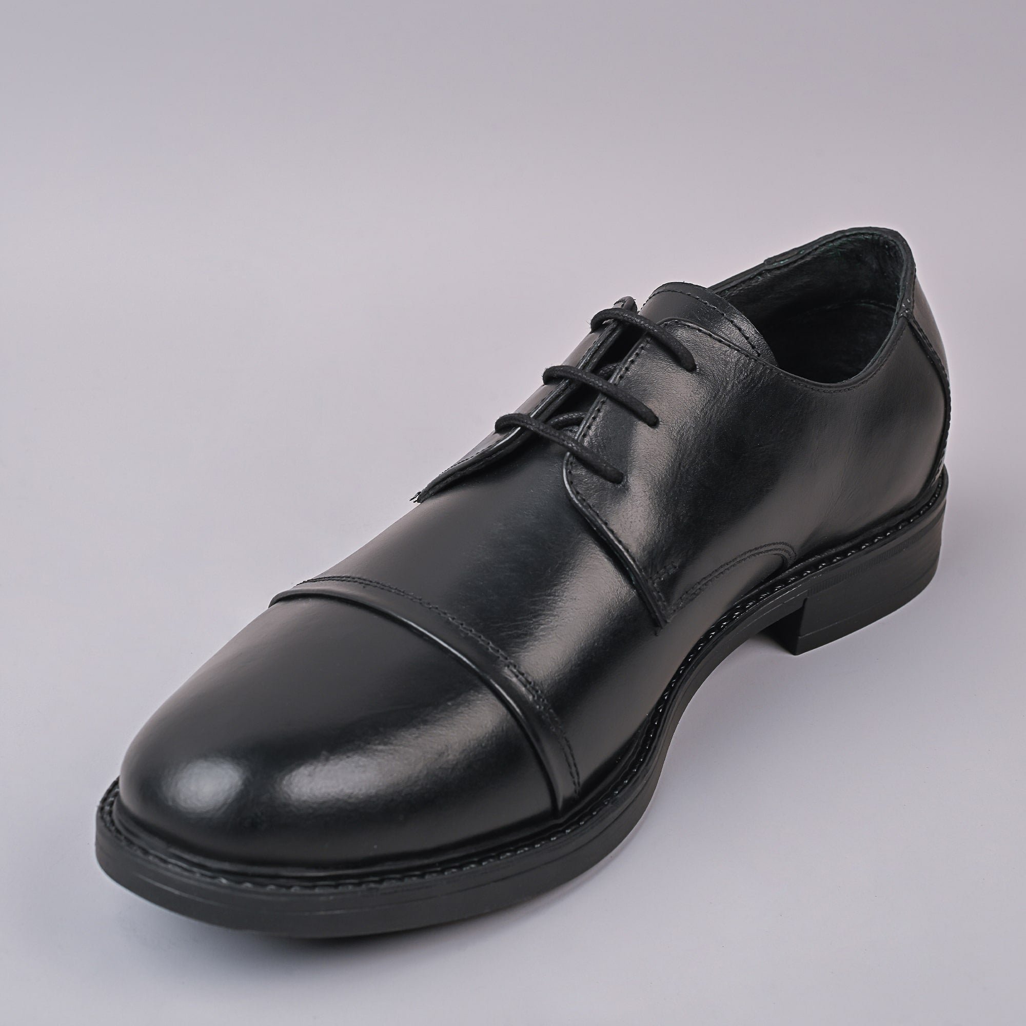 This black leather cap-toe derby shoe exhibits a timeless formal design, defined by its separated lacing and structured upper. The cap-toe detail creates a segmented look at the front of the shoe, distinguishing it from plain styles. The leather is finished with a low-gloss polish that reflects light subtly, suggesting quality craftsmanship. The quarters are stitched on top of the vamp, true to the derby style, and the heel counter is firm and reinforced. There’s a slight curve in the arch area for ergonomic support. The sole is sturdy and likely made of leather, with a small rise at the heel. The shoe overall has a classic English silhouette with a modest profile. The insole appears padded for additional comfort during long wear.