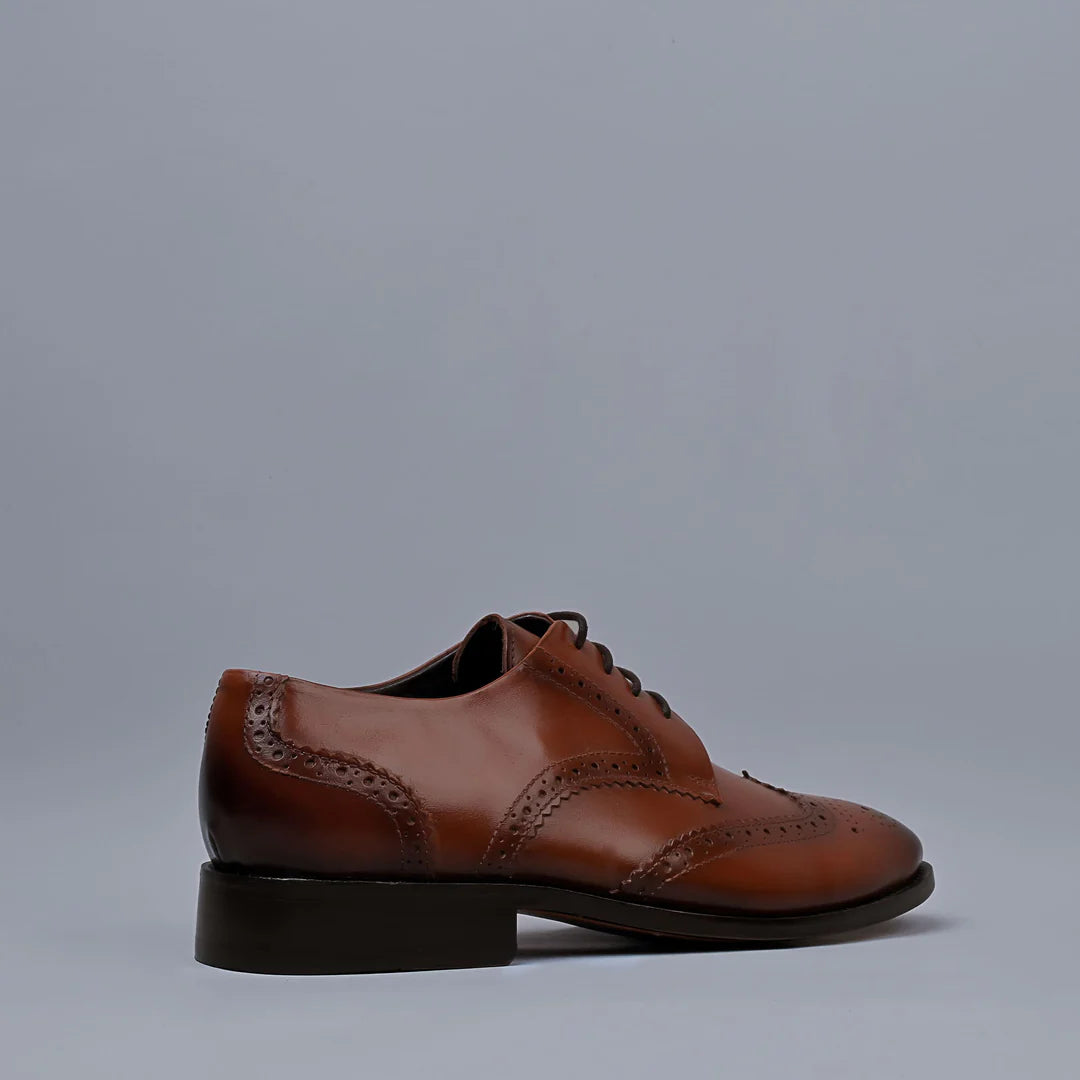 These tan-brown wingtip brogues are made from premium leather, finished with a rich, burnished patina that transitions beautifully from light tan to darker edges. Decorative broguing adorns the toe, vamp, and sides, adding a layer of elegance to its traditional silhouette. The W-shaped wingtip and perforated medallion toe display expert craftsmanship and detail. The open lacing and round toe give it a relaxed yet structured form. The sole appears robust and well-stitched, promising durability and daily wearability. A soft leather lining provides comfort and breathability, while the heel is moderately built for support. The rich color gradient is both warm and versatile, enhancing its aesthetic appeal. Ideal for semi-formal occasions, these shoes can easily elevate tailored trousers or smart-casual looks. They strike the perfect balance between tradition and trend.