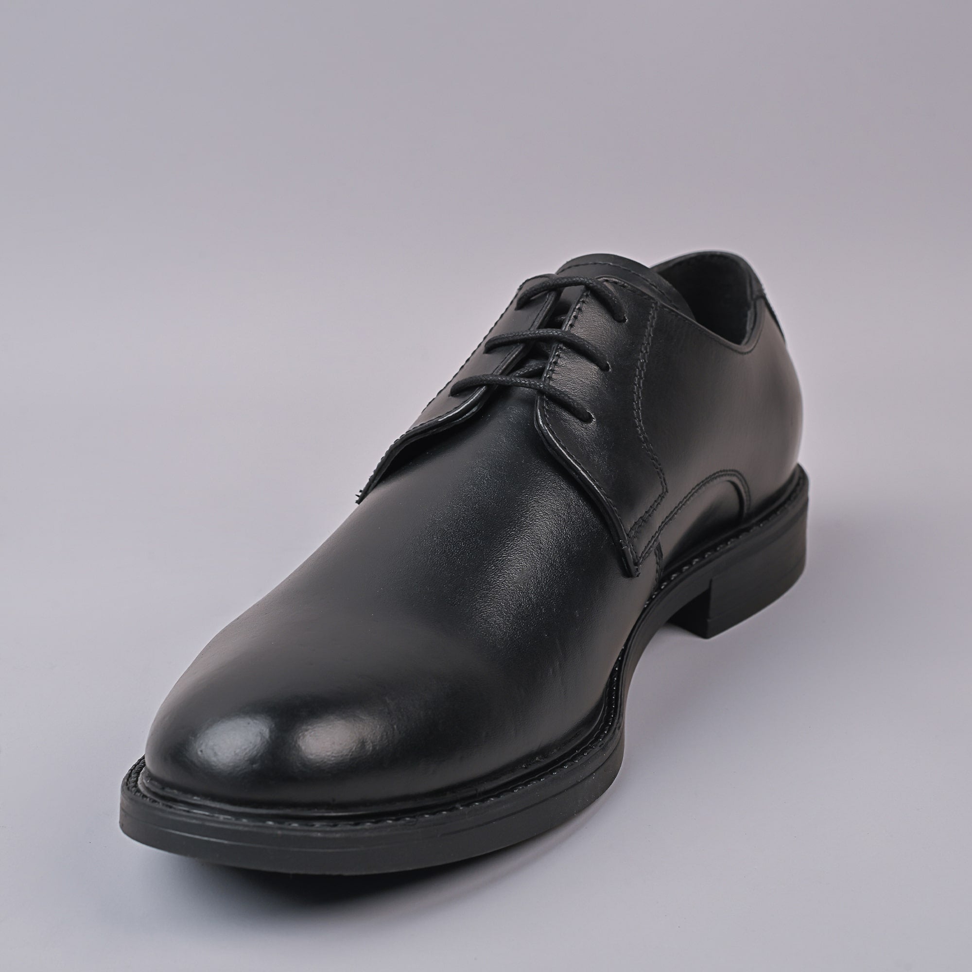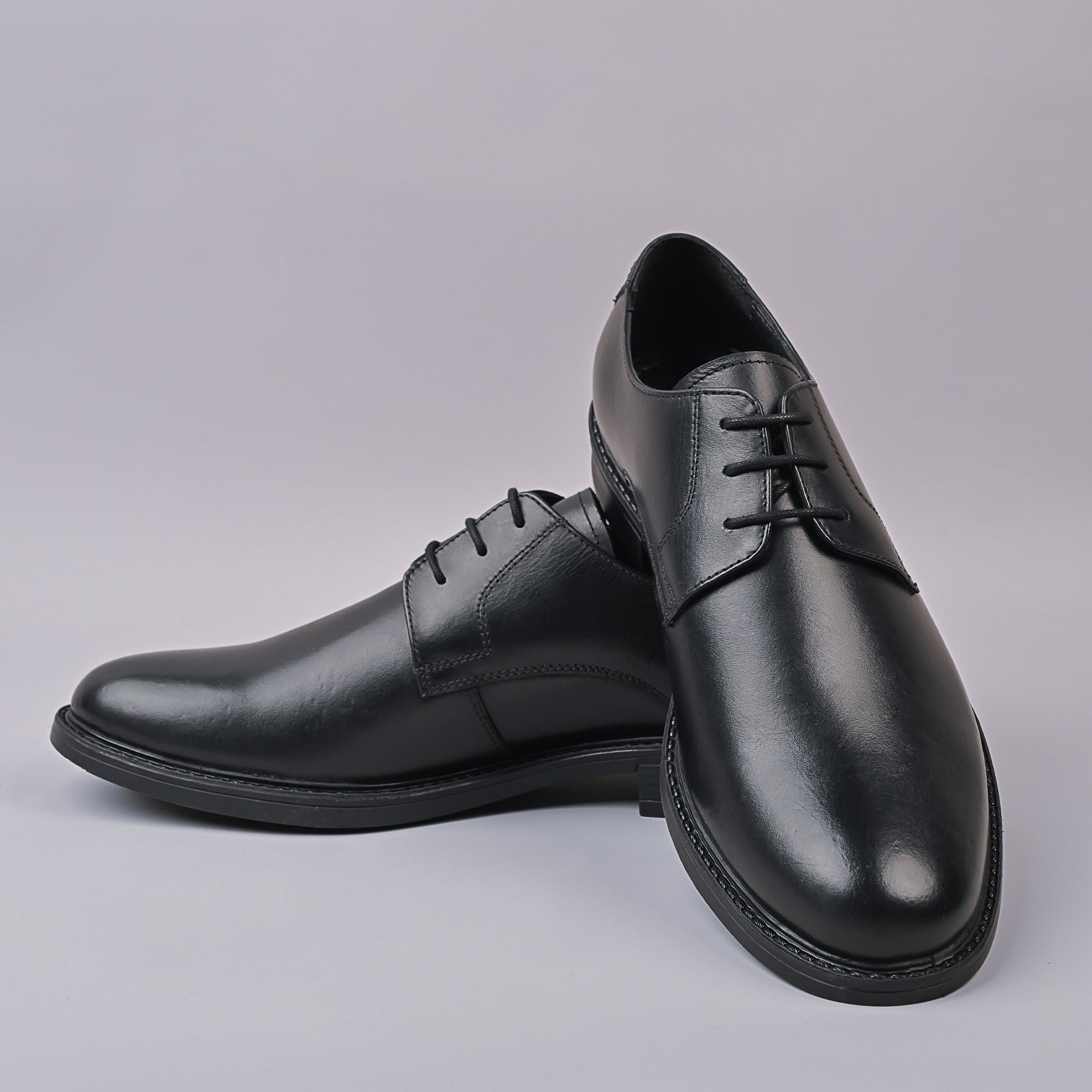 This pair of black plain-toe derbies is built with simplicity and elegance at the forefront. The upper is uninterrupted by cap toes or wingtip designs, making it extremely minimalistic and formal. Made from smooth leather, the shoe reflects light uniformly, giving it a pristine appearance. The open-lace derby structure is evident with the eyelet tabs sewn on top of the vamp. The inner edges are finely stitched and seamlessly blend into the shoe’s construction. The heel is proportionally higher than the front, aiding posture and stride. The outsole is dark, most likely rubber-based for practicality, but refined in appearance to match the formality of the design. There's a subtle padding inside to ensure comfort during extended wear. This shoe embodies the understated sophistication of traditional men’s dress footwear. The shape is neither too pointy nor square, striking a timeless balance.